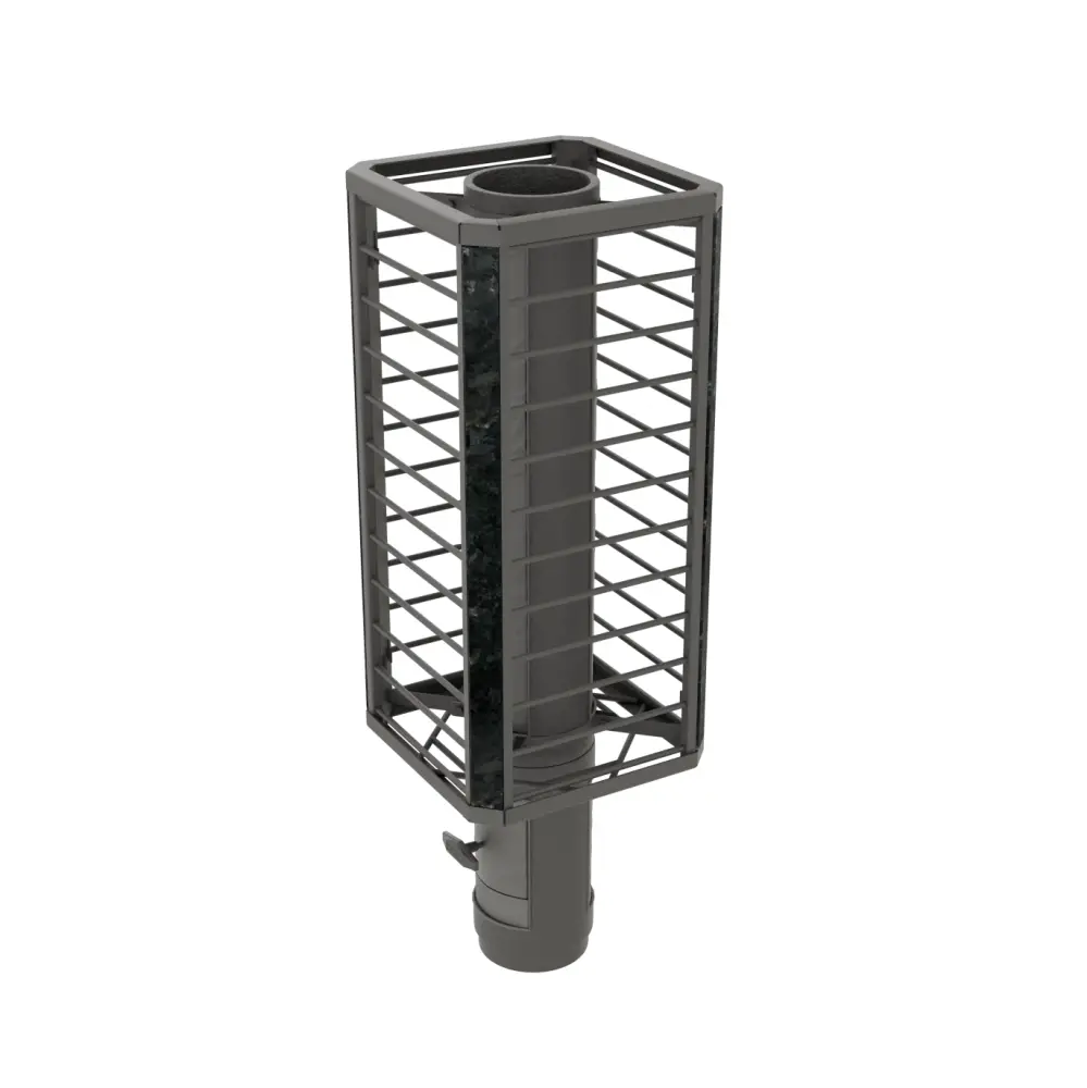 Сетка-каменка защищает от излучения, уменьшая поверхность открытой трубы, снимает тепло с ее стенок и направляет его на прогрев камней.