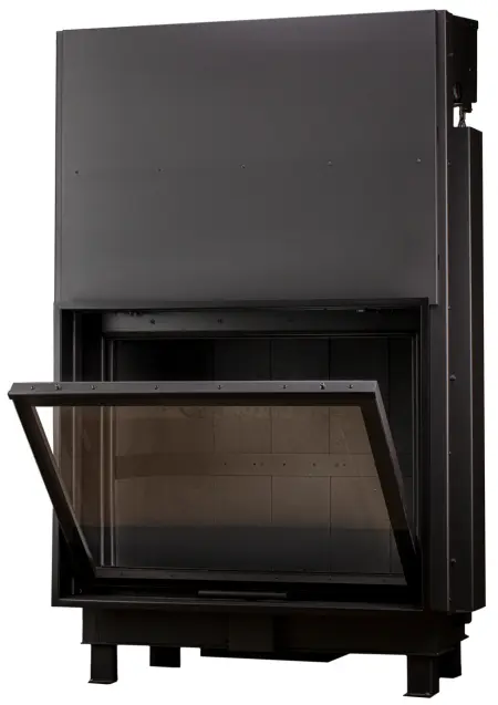 Современная и функциональная топка с плавным и бесшумным подъёмным механизмом дверцы. Дно топки выполнено в виде чаши с бортом и выложено шамотным кирпичом. Задняя и боковые стенки топочной камеры футерованы 3D вермикулитом. Шамот и вермикулит – это природные, экологически чистые материалы, при их нагревании не выделяется запах и токсичные вещества.