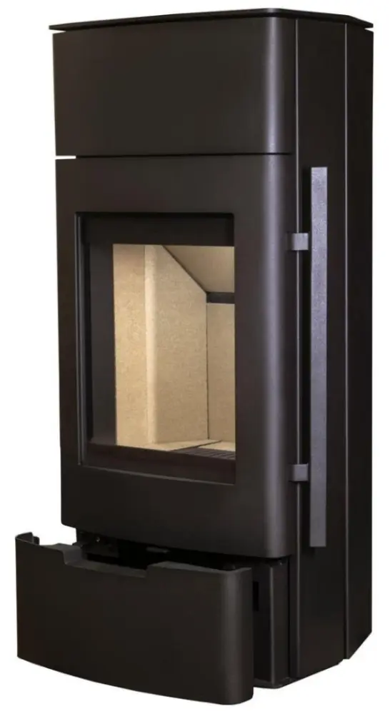 Большое прямое стекло открывает отличный вид на огонь. Футеровка топки выполнена из вермикулита. Очаг с возможностью подключения притока воздуха извне. Выдвижной нижний ящик оснащен системой "Push-to-open" с направляющими. Дымоход, диаметром 150 мм, подключается сверху или сзади.