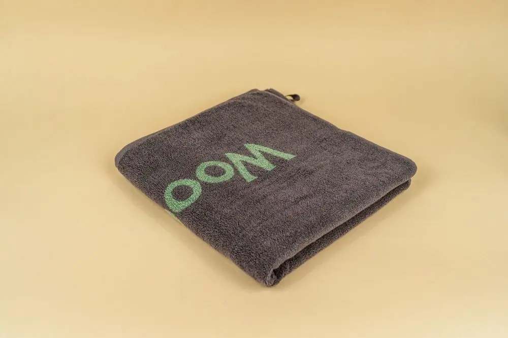 Полотенце махровое размером 70*140 см с логотипом Woodson выполнено в цветовой гамме серый/светло-зелёный.